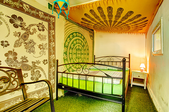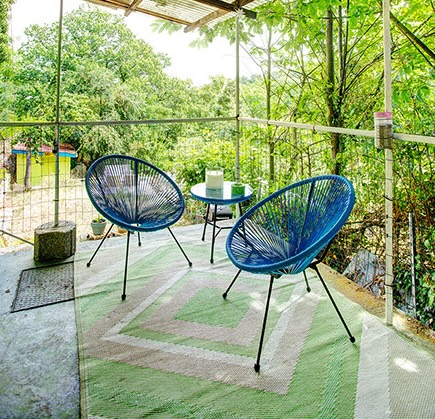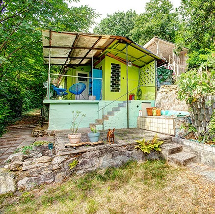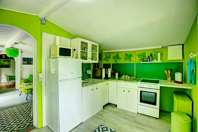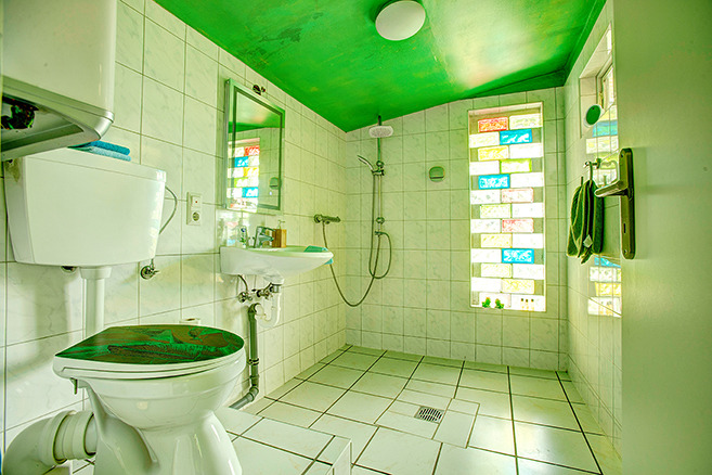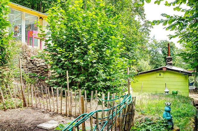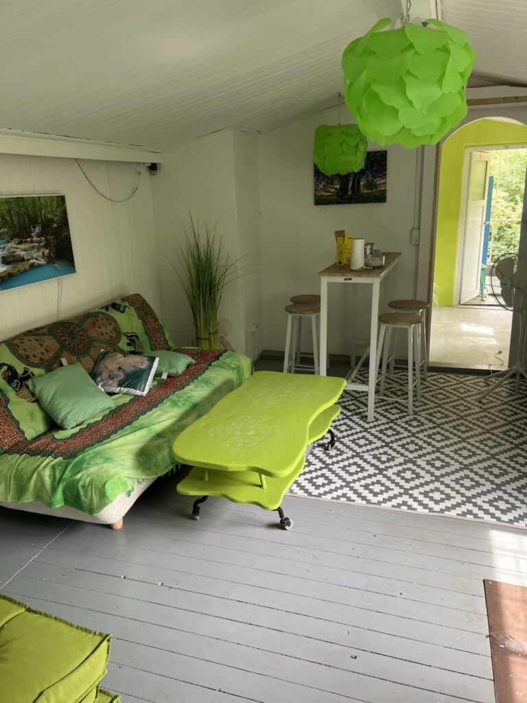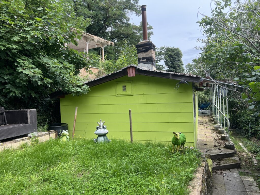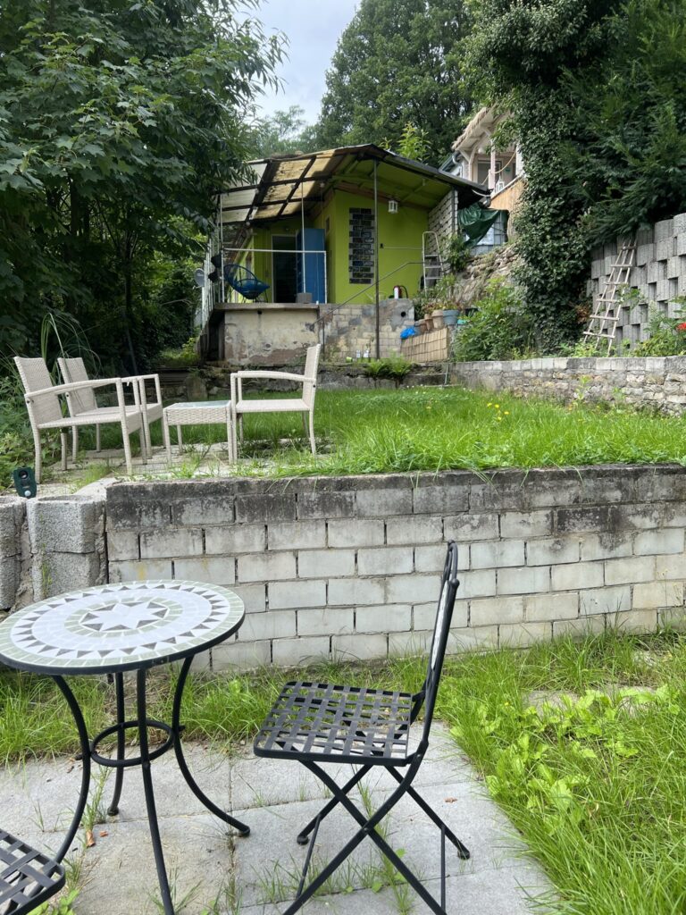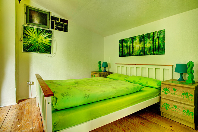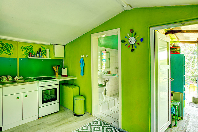Fast alles ist in Grün gehalten und im Vorgarten gibt es zwei Gemüsebeete zur Ernte für euch. Es gibt eine kleine Terrasse, die, blickgeschützt durch Bäume, zum chillen einlädt.