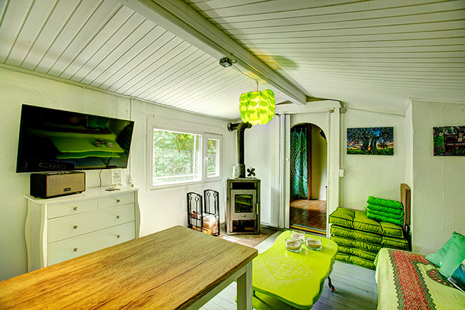 Im Wohnzimmer findest du eine ausziehbare Couch, auf der zwei Personen schlafen können, wenn diese sich mögen (Bettwäsche wird gestellt). Außerdem ein kleiner Frühstückstisch mit Hochstühlen, TV, Bluetooth Musikbox, ein schöner Holzofen für die kalten Tage mit ausreichend Feuerholz, sowie einer regelbaren Infrarotheizung.